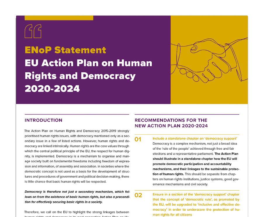 Therefore, we call on the EU to highlight the strong linkages between human rights and democracy in its next generation Action Plan on Human Rights and Democracy (2020–2024) and to accord democracy support with at least the same importance as the protection of human rights receives. This would be a basis for more effective und sustainable securing of human rights in most countries.